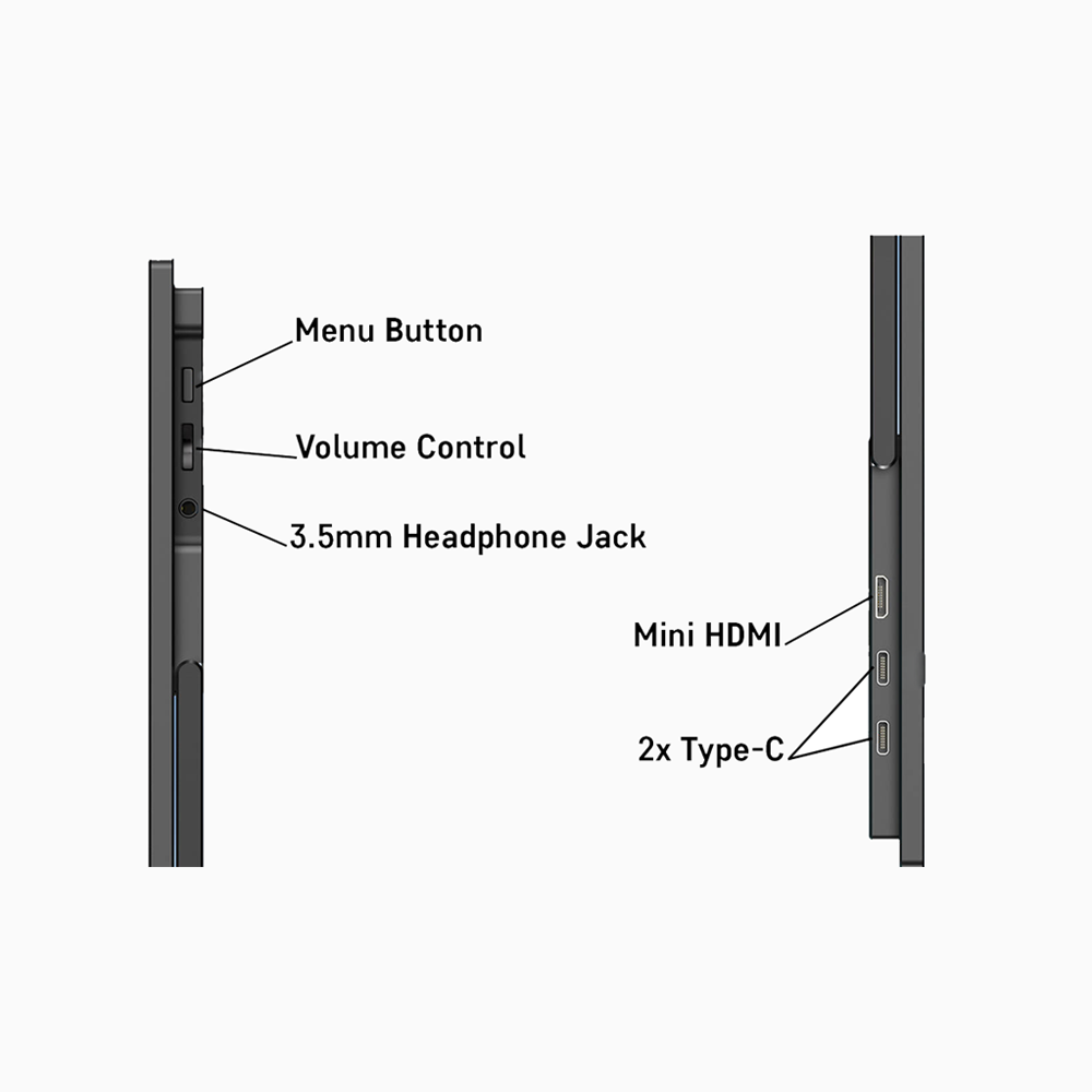 Easily connect to the monitor via Mini HDMI or the two Type-C ports. Compatible with Laptops, Phones, Gaming Consoles and more. Access reverse charging from one of the Type-c ports on the side of the monitor.