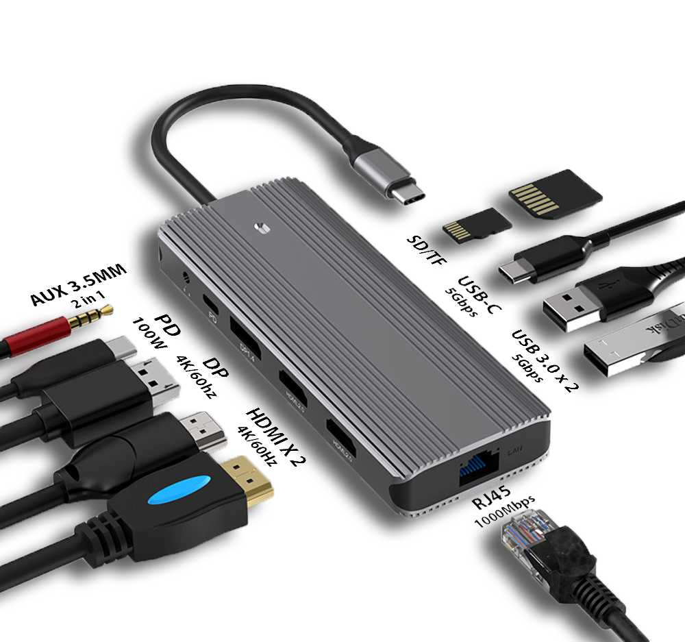 The Chillitech® Pro USB C Docking Station is a state-of-the-art solution designed to transform your laptop into a multitasking powerhouse. Featuring triple 4K 2.0 HDMI and 1.4 DisplayPort outputs, this docking station enables an immersive and crystal-clear viewing experience across multiple monitors, ideal for professionals and creative enthusiasts. With a robust 100W Power Delivery (PD) port, rapid charging for your laptop is assured, while the 1Gbps Ethernet ensures a reliable and high-speed network connection. The inclusion of three 5Gbps USB ports enhances connectivity options for peripherals, and the 3.5mm audio jack adds an audio component to the mix. The SD/TF dual card slots provide convenient access for memory cards.