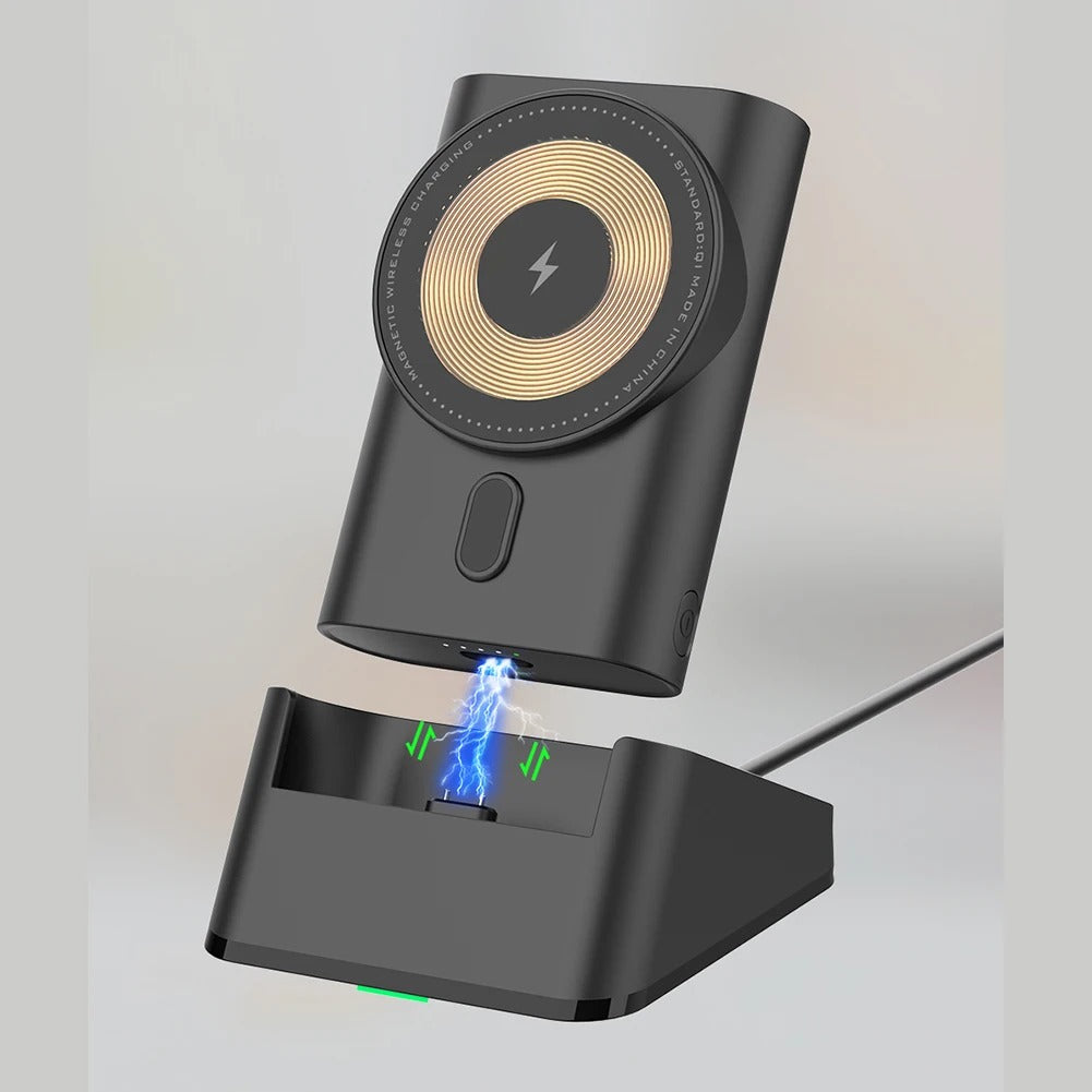 Designed for maximum convenience, the Chillitech 3-in-1 Magnetic Charging Dock features a portable magnetic power bank and a charging station stand, complete with a USB-C cable for versatile use. Its magnetic docking ensures a secure and efficient charge every time, while the built-in LED lights provide a stylish touch and indicate your device's charging status.