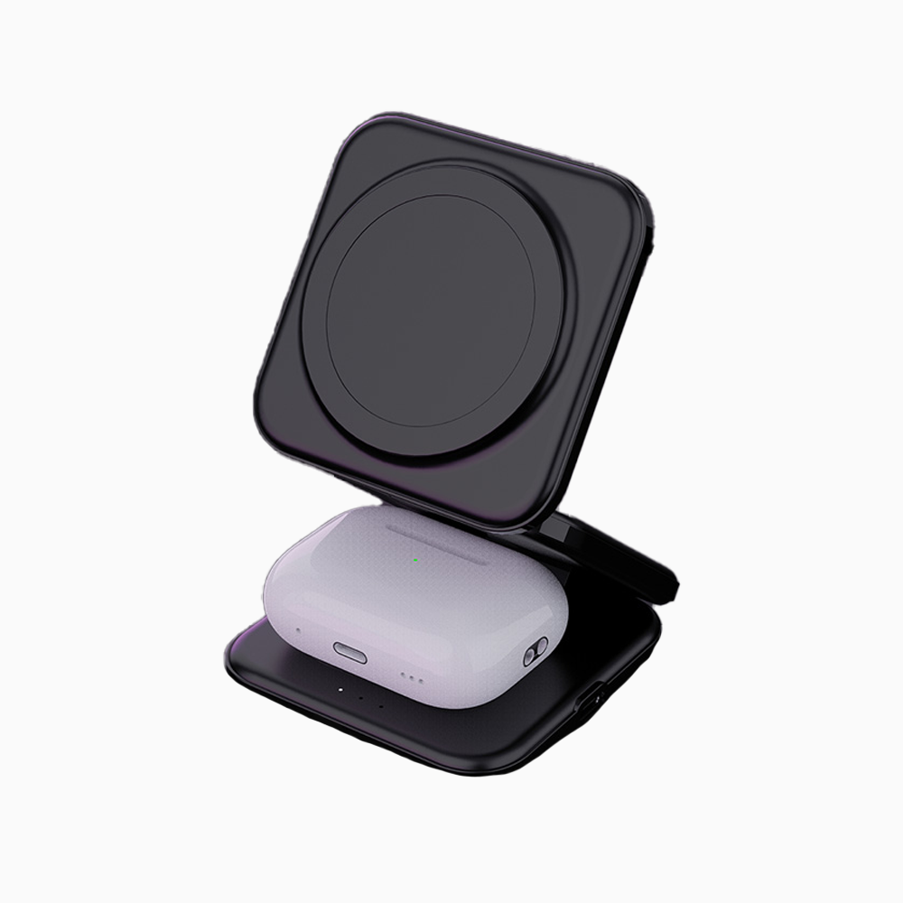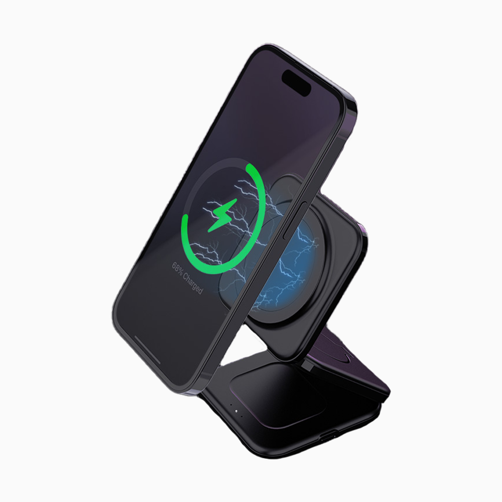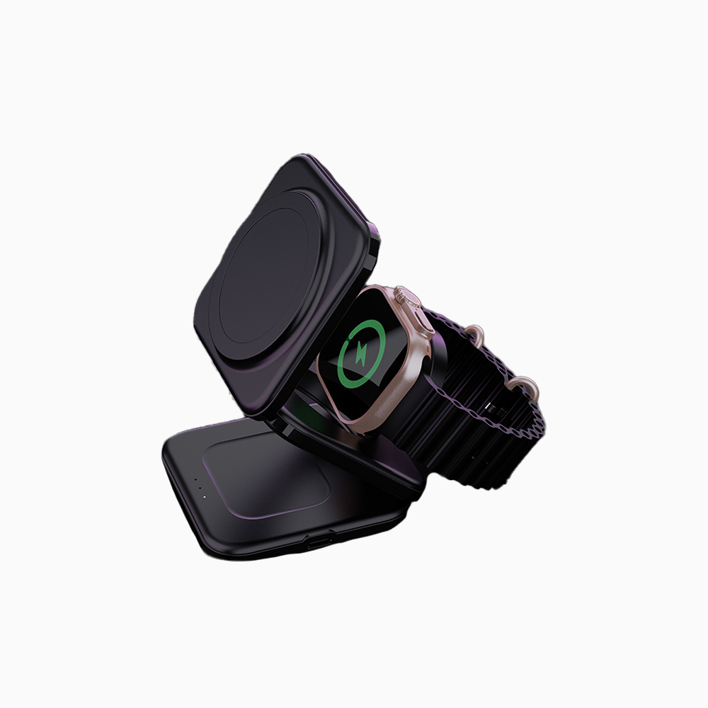 The ChargeFold Go Magnetic Charger is compact and efficient 15W fast wireless charging station designed for versatility. This sleek device allows simultaneous charging of multiple devices such as iPhone, Apple Watch, and AirPods, offering convenience at home or on the go. Experience seamless charging with reliable magnetic connectivity and quick charging capabilities, keeping your essential devices powered up effortlessly.