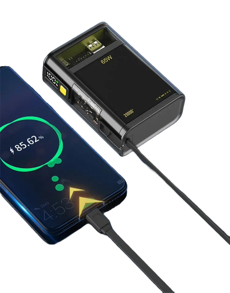 Designed for versatility, this transparent battery pack is a compact powerhouse capable of super-fast charging for a range of devices, including laptops, MacBooks, iPhones, Samsung devices, tablets, and more. With a robust 65W output and a generous 20000mAh capacity, this USB C portable laptop battery charger ensures that you stay charged and connected throughout your day.